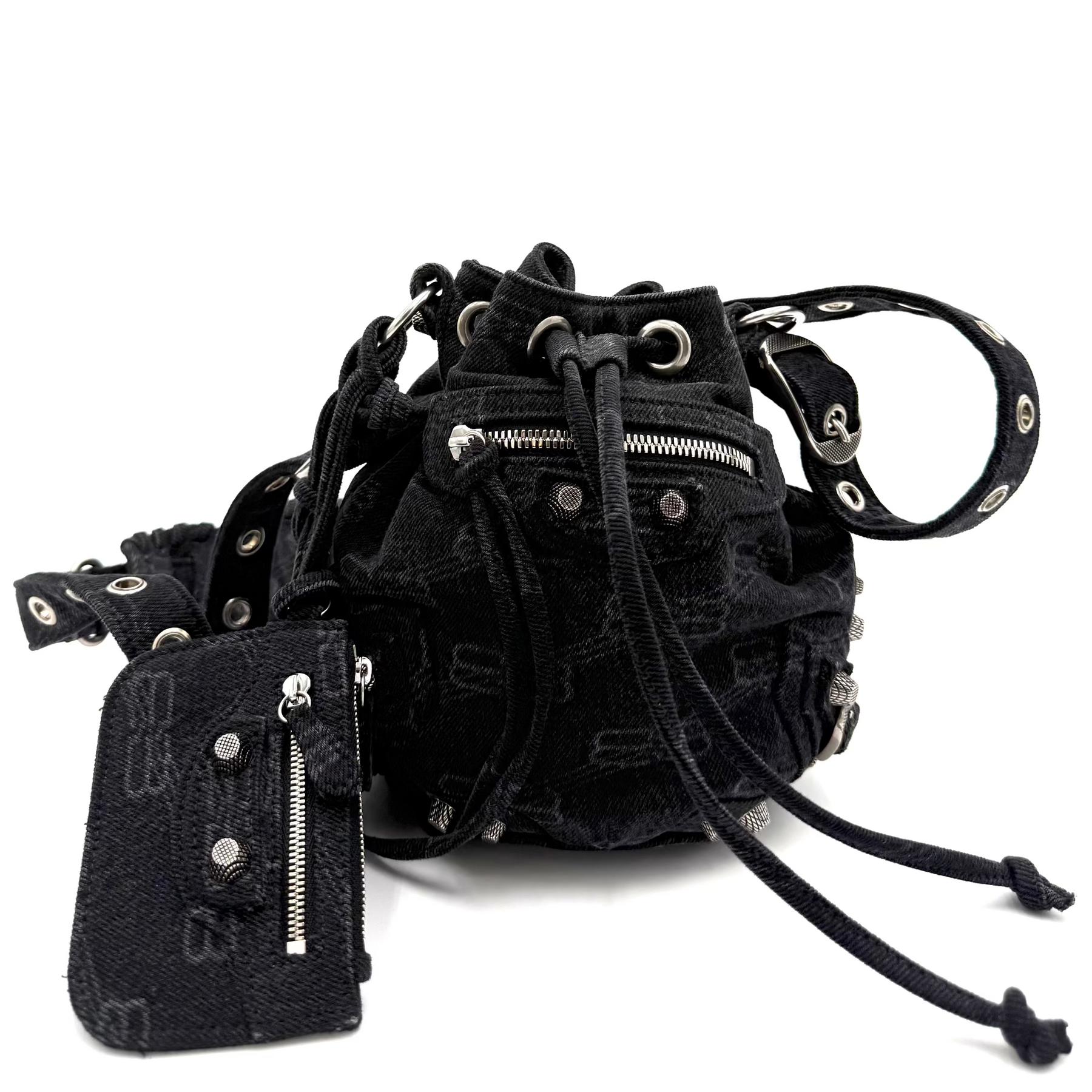 Crafted from washed denim with aged silver-tone hardware, this hobo bag showcases textured hardware, a scrunched silhouette, and an adjustable strap for easy crossbody or shoulder wear. It comes with a coin pouch and a denim-bound mirror, both of which can be removabled and carried separately.