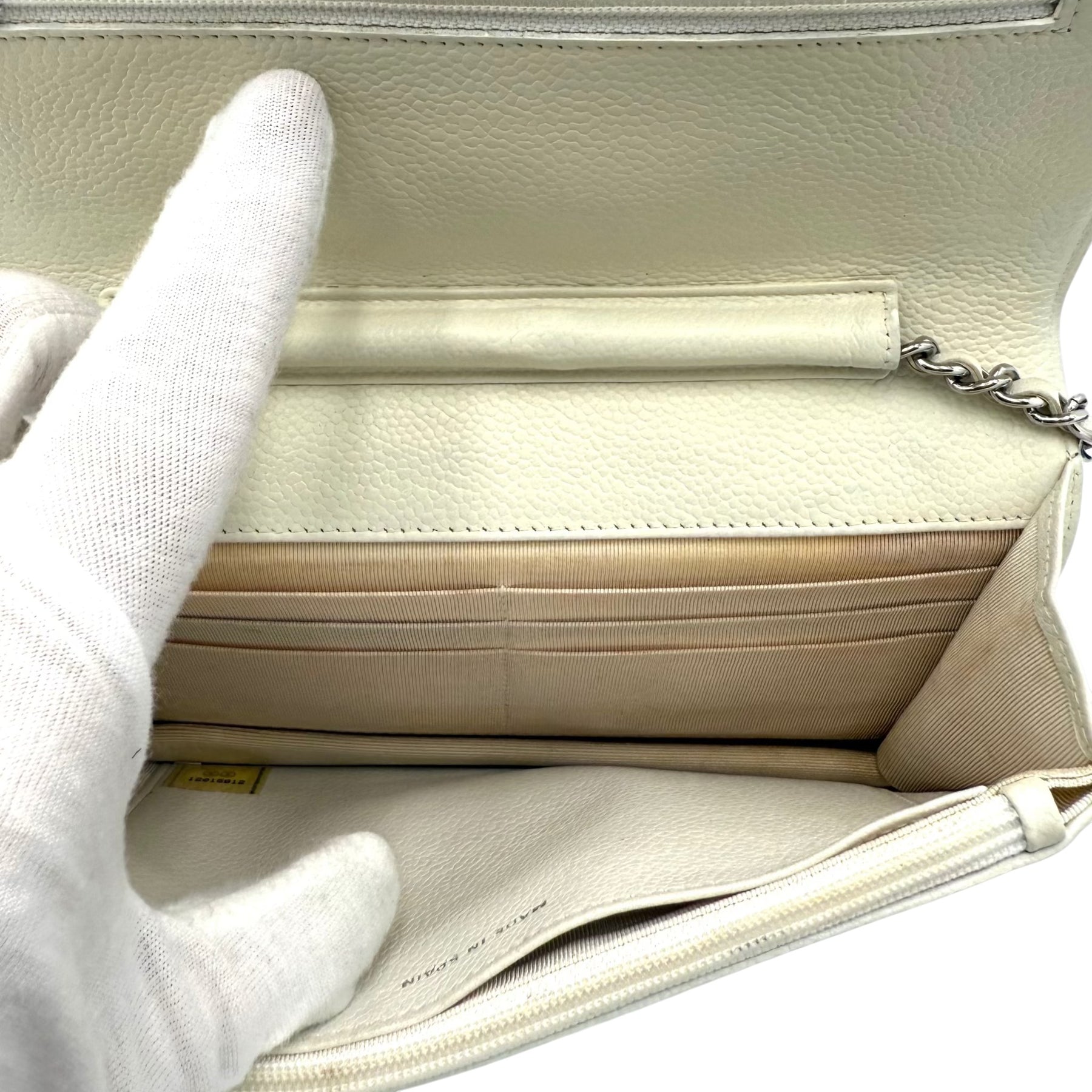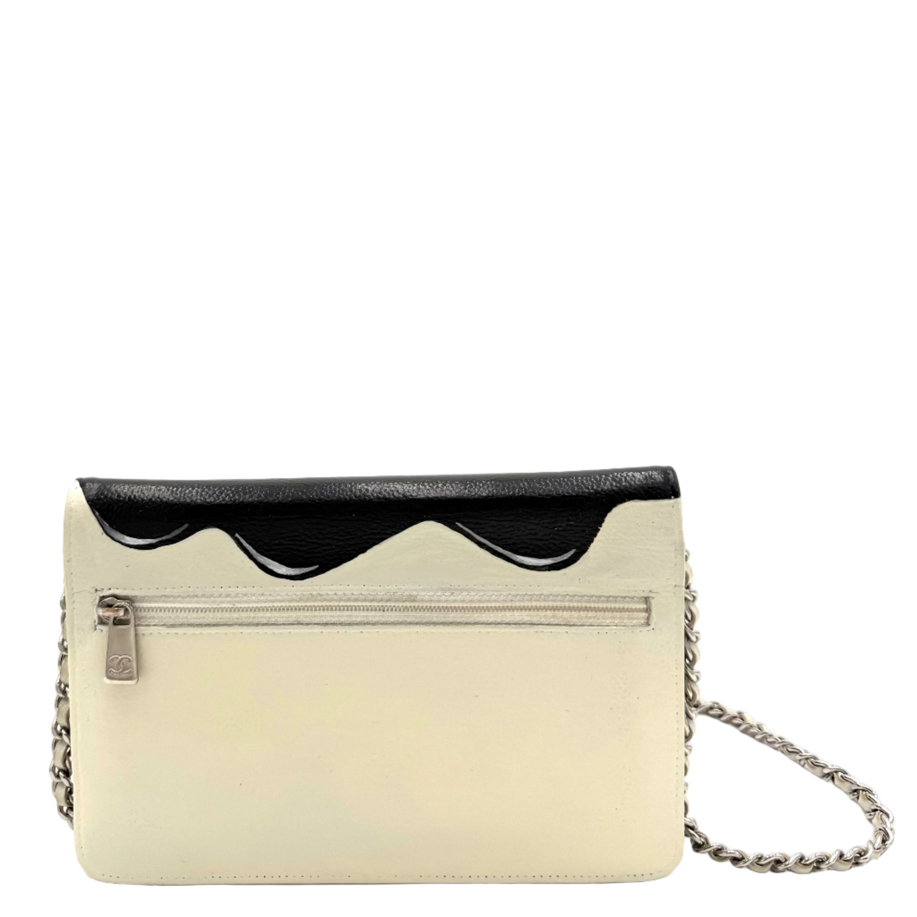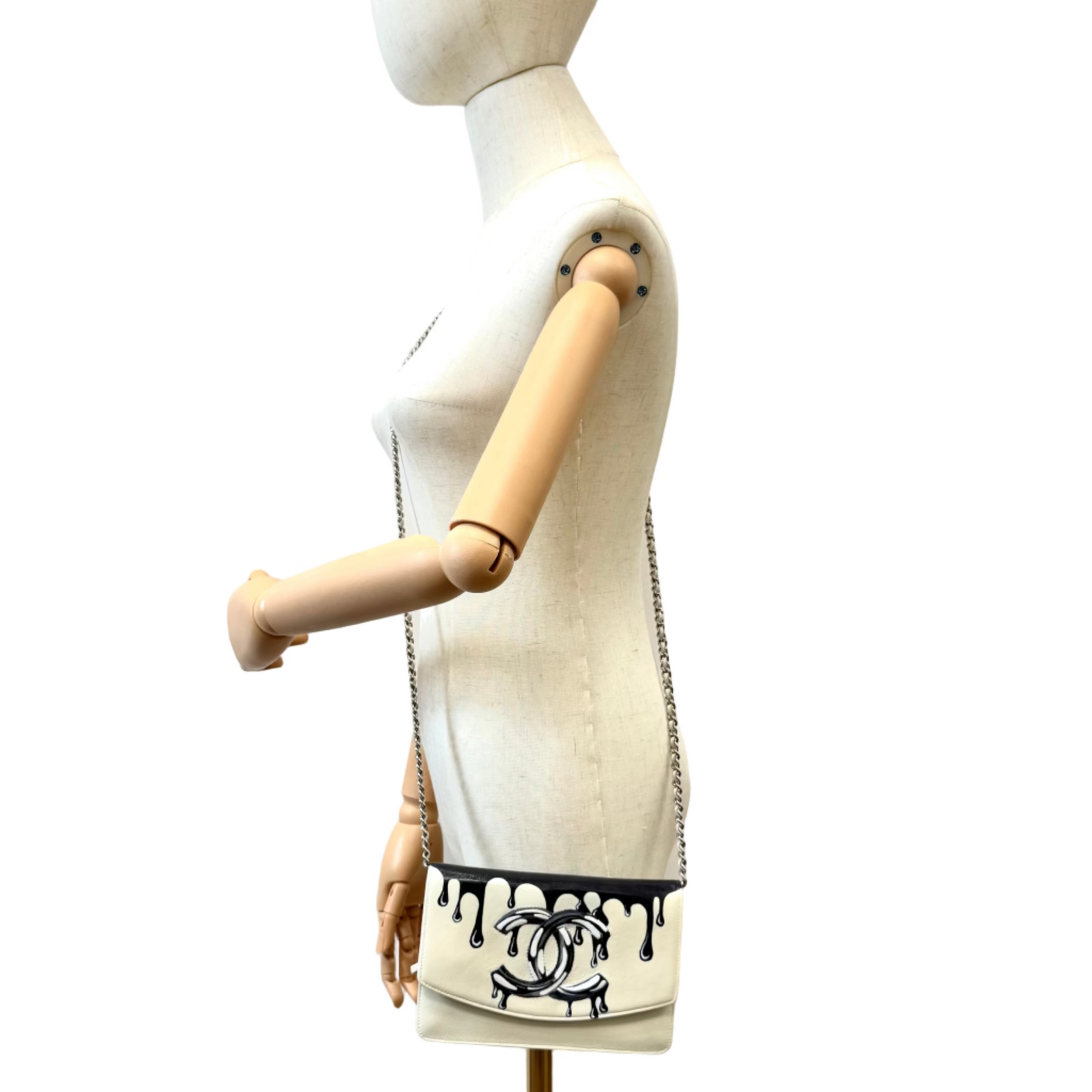 Elevate your collection with this exclusive Chanel Wallet on Chain, transformed into a true wearable artwork. This pre-owned Chanel piece features a hand-painted black and white drip design on a soft cream leather base, creating a striking contrast that blends classic elegance with contemporary edge.