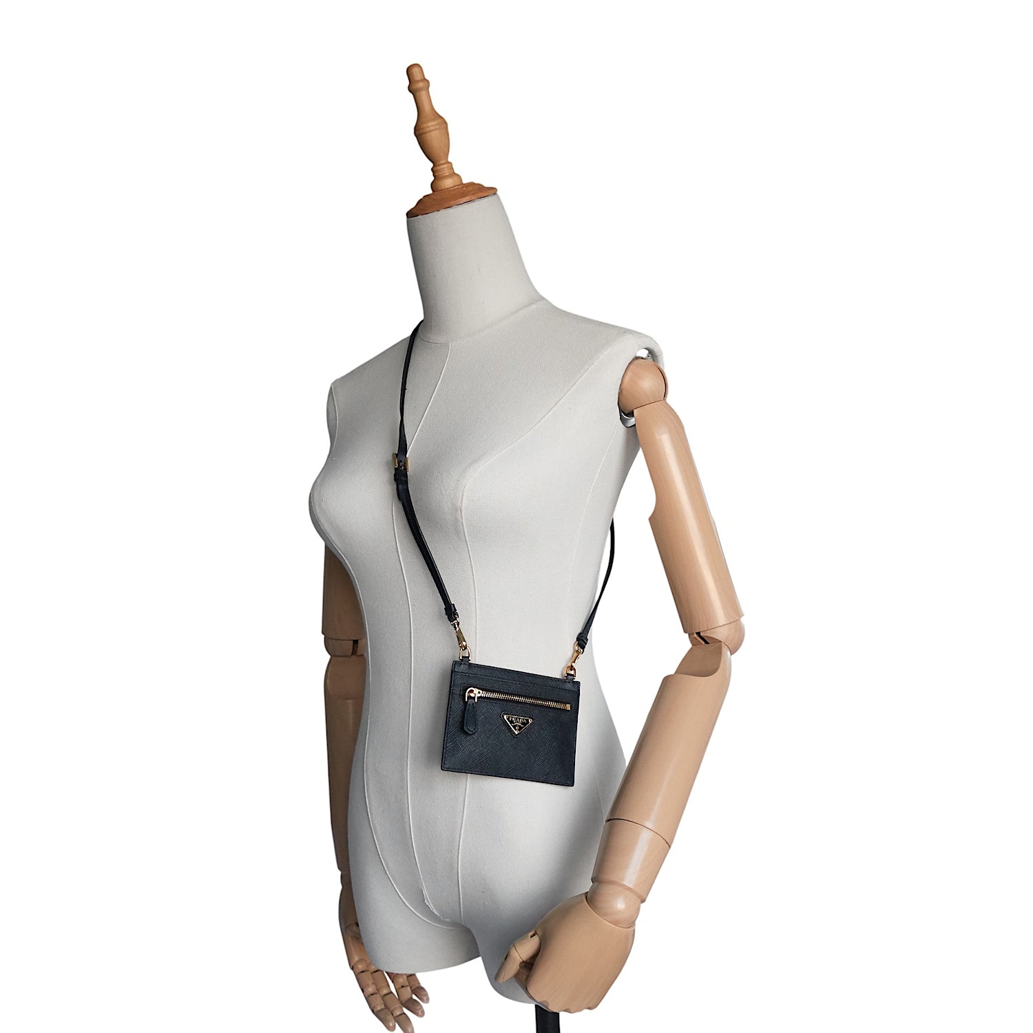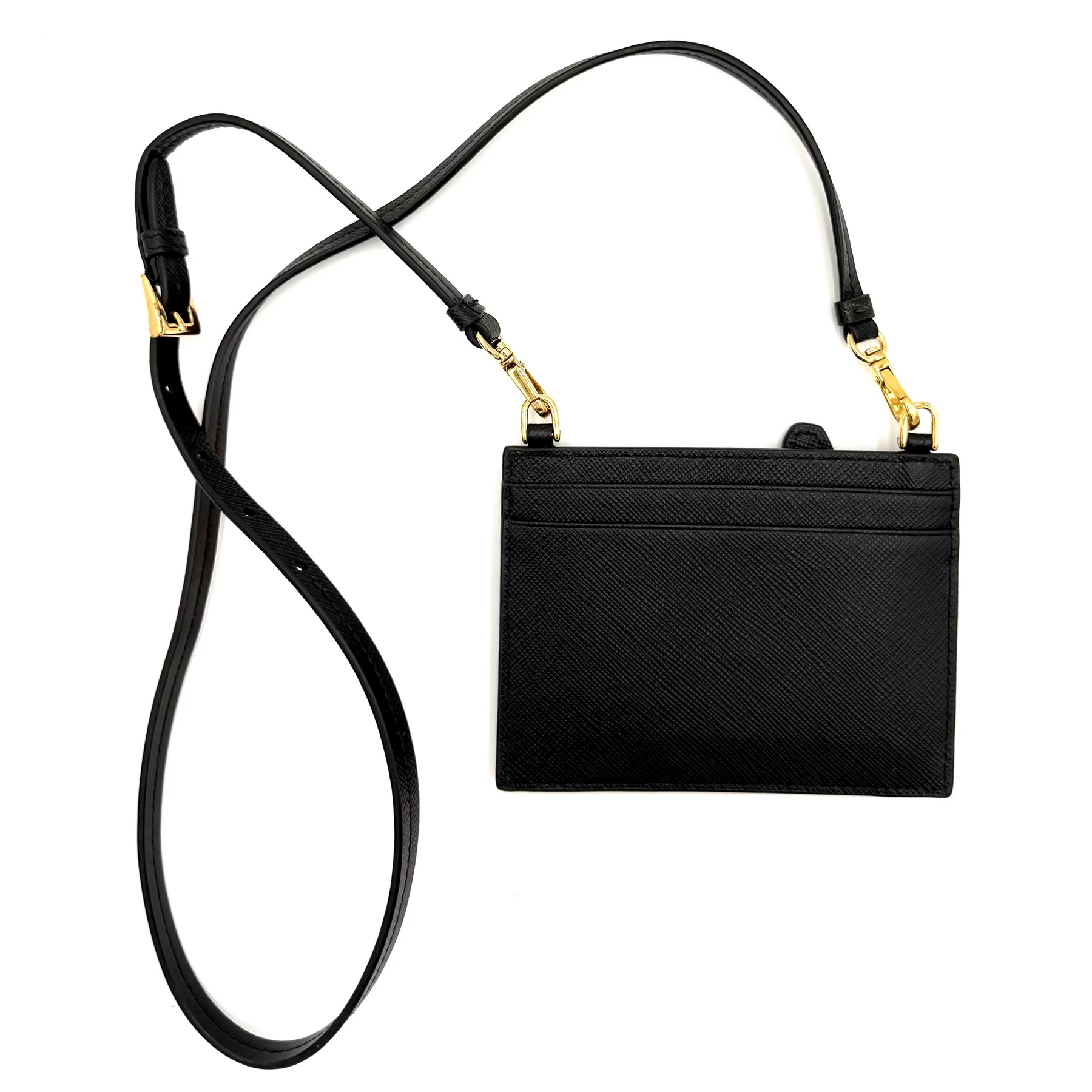 Prada's iconic triangular logo sits front and centre on a slim Saffiano-leather card holder that's topped with an optional shoulder strap for easy hands-free convenience.