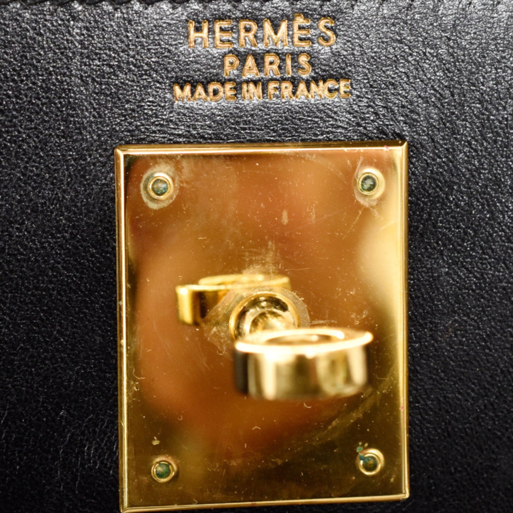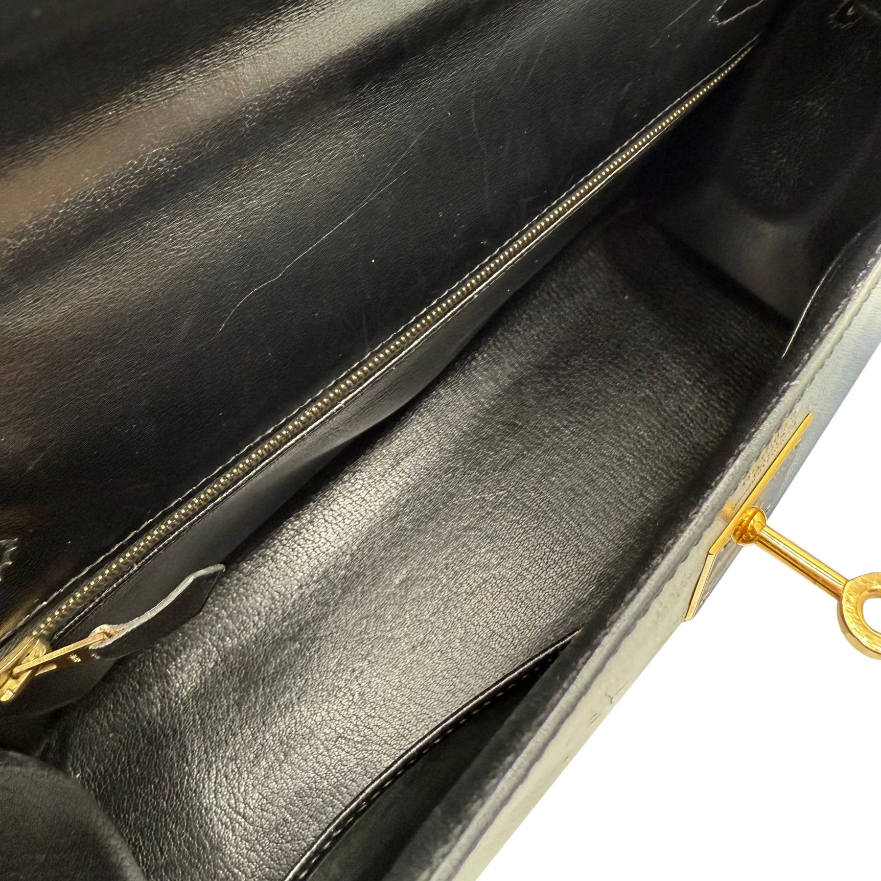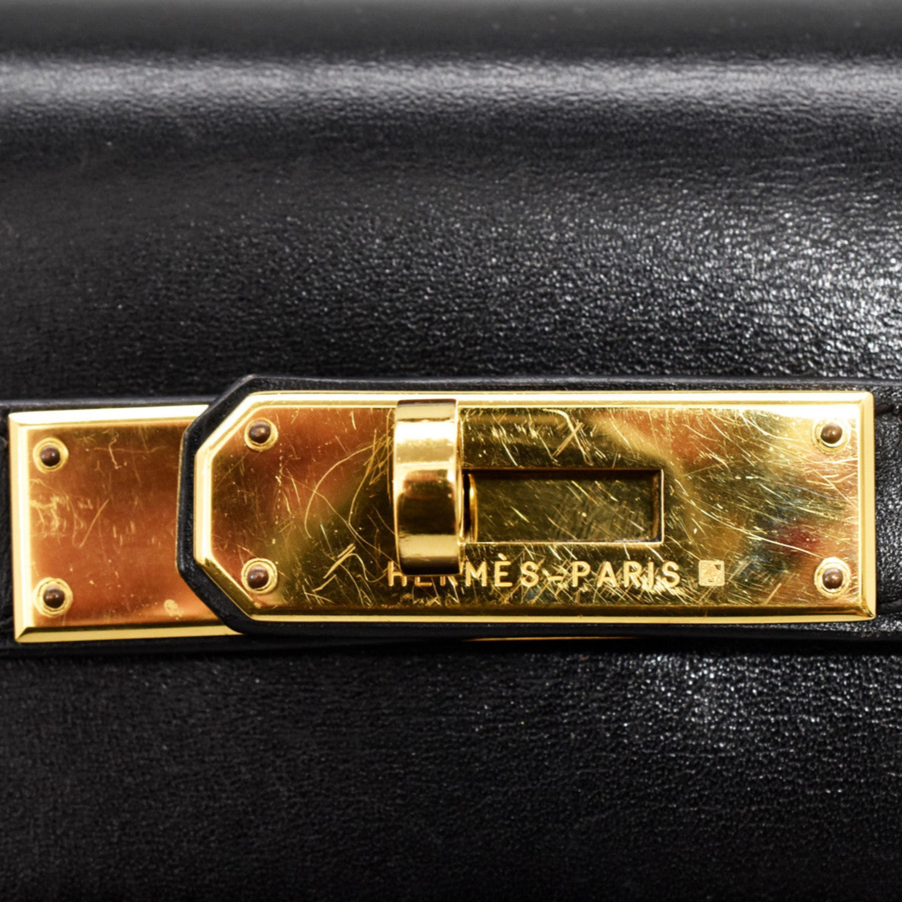 Timeless elegance meets impeccable craftsmanship in this Hermès Kelly 32 Sellier, crafted from sumptuous black box leather renowned for its glossy finish and structured durability. This iconic silhouette is beautifully accented with gold-tone hardware, elevating its classic allure.