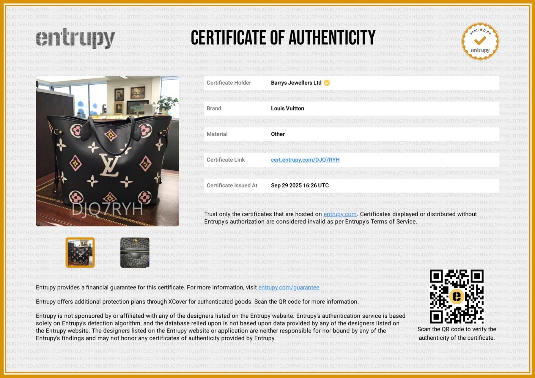 Louis Vuitton black Neverfull in the MM size and limited edition Wild at Heart print. This bag is the both the perfect size and colours for everyday use. Classic black with fun pops of pink, white and yellow, make this a great addition to your LV collection. Fun cheetah print interior with an interior pocket.