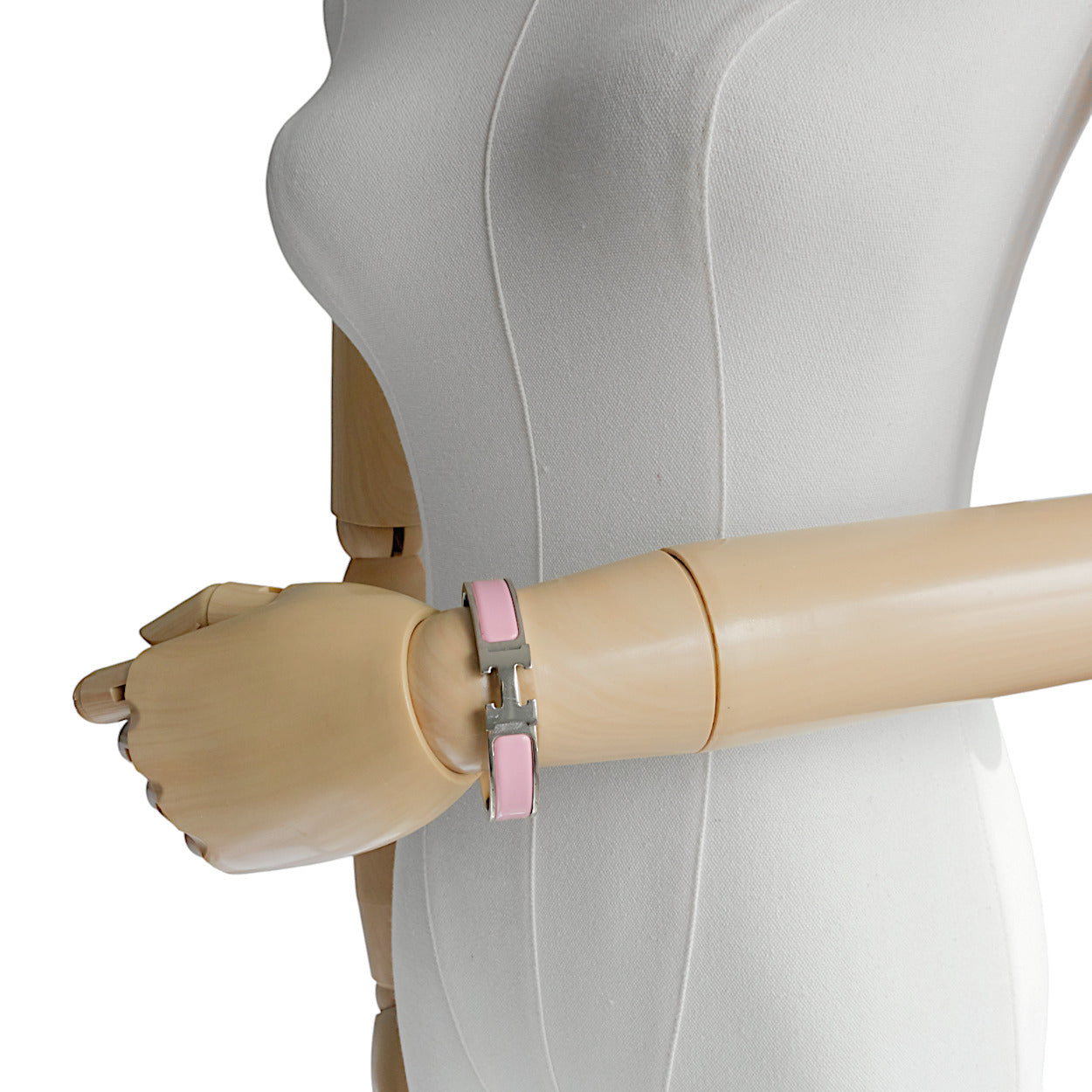 This is a narrow bracelet with a hinged "H" design, made of palladium-plated hardware inlaid with pink enamel.