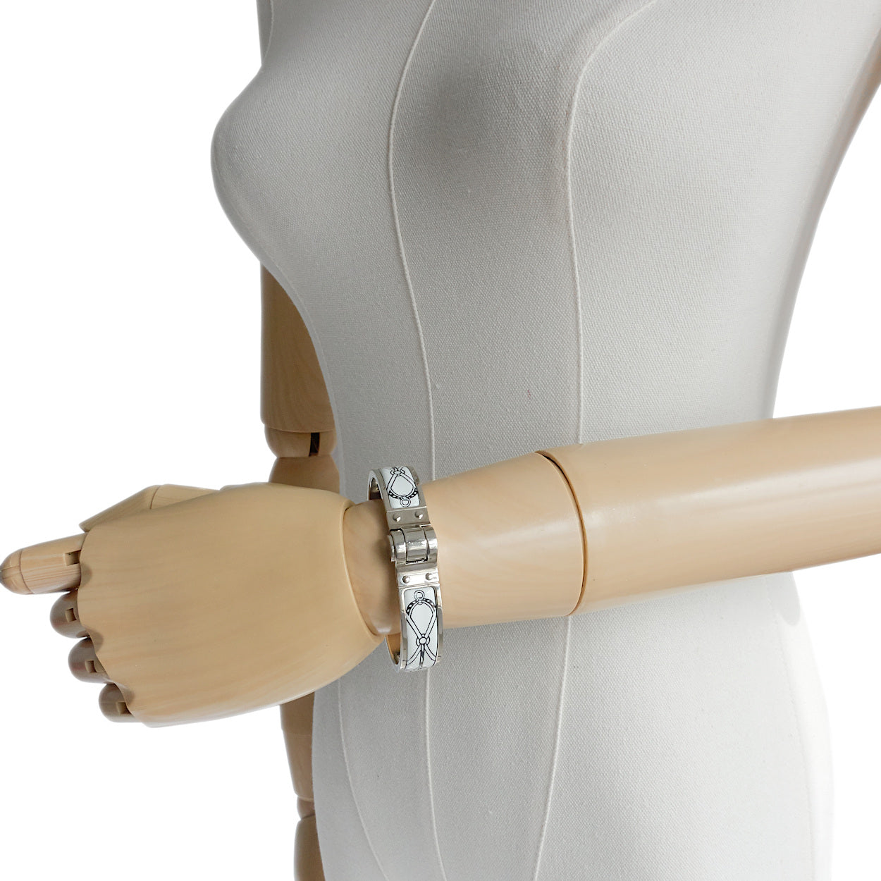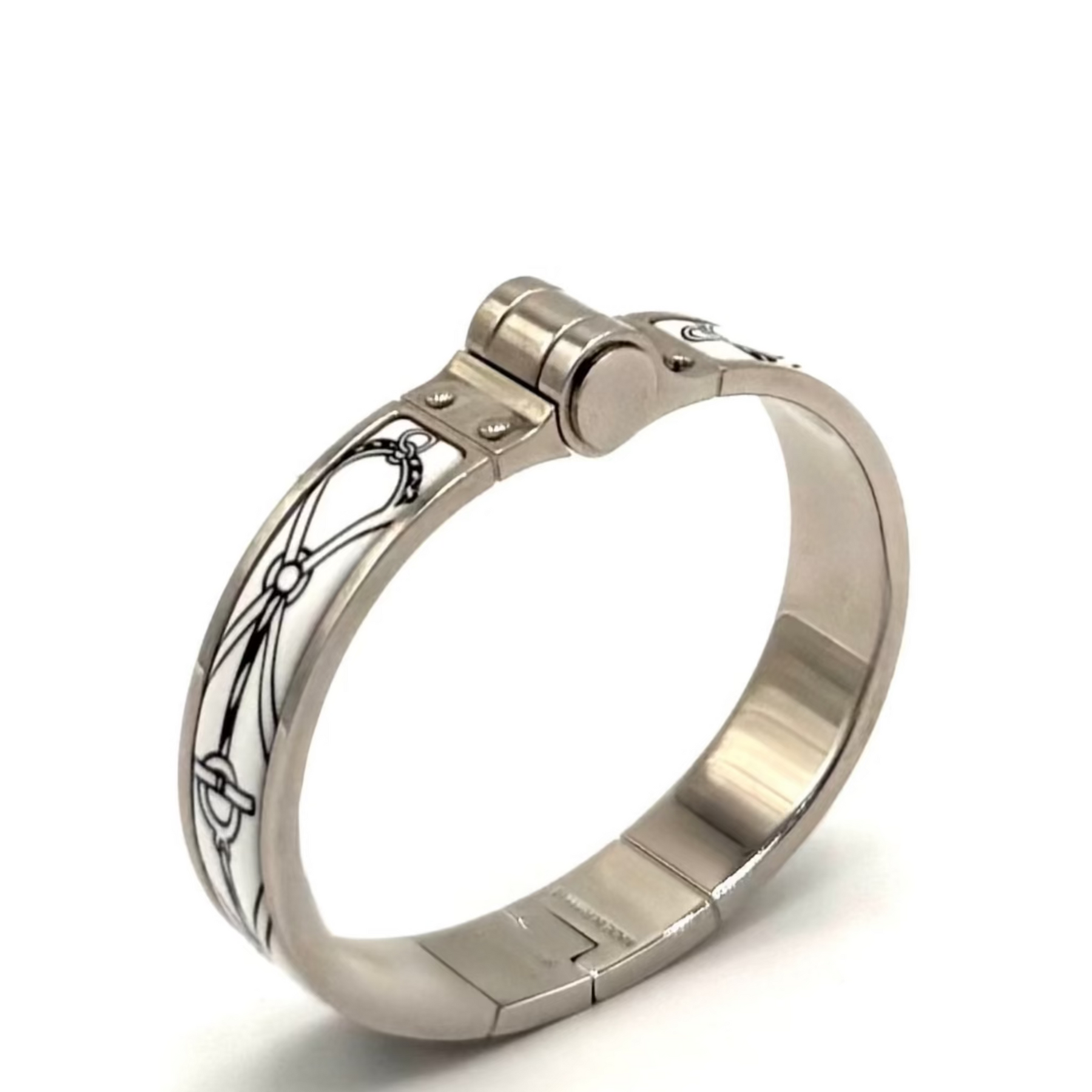 The Hermès Charnière bracelet features a refined enamel design inspired by the house’s equestrian heritage. Interwoven bridle and rope motifs evoke the world of fine saddlery, a nod to Hermès’ origins as a harness maker.