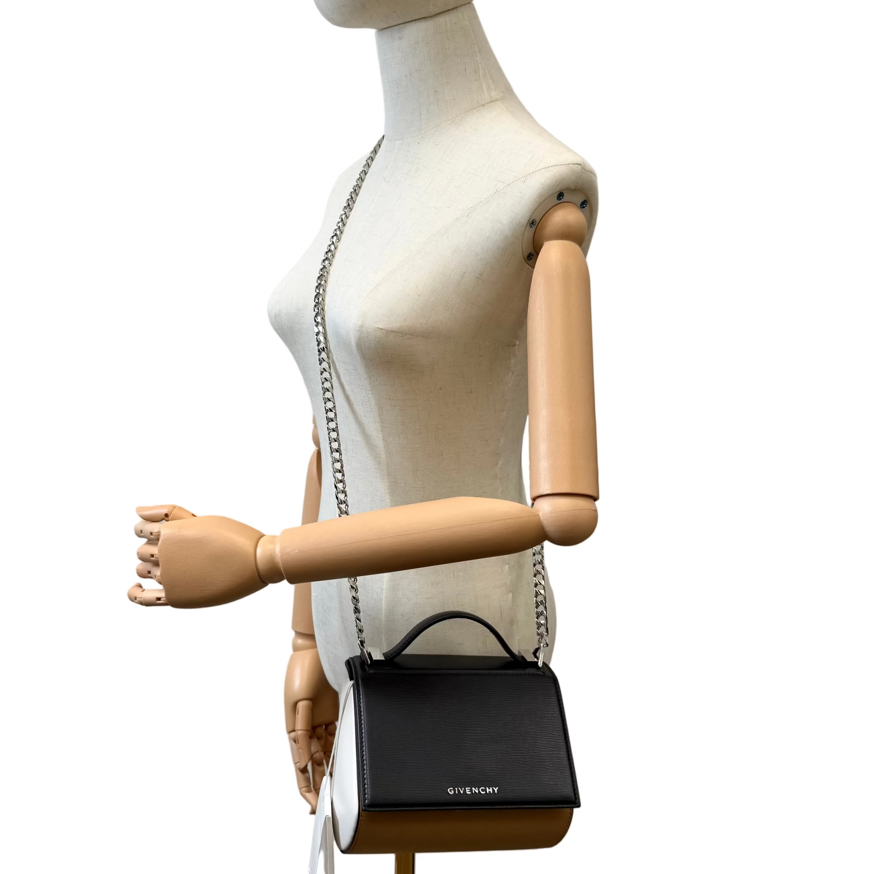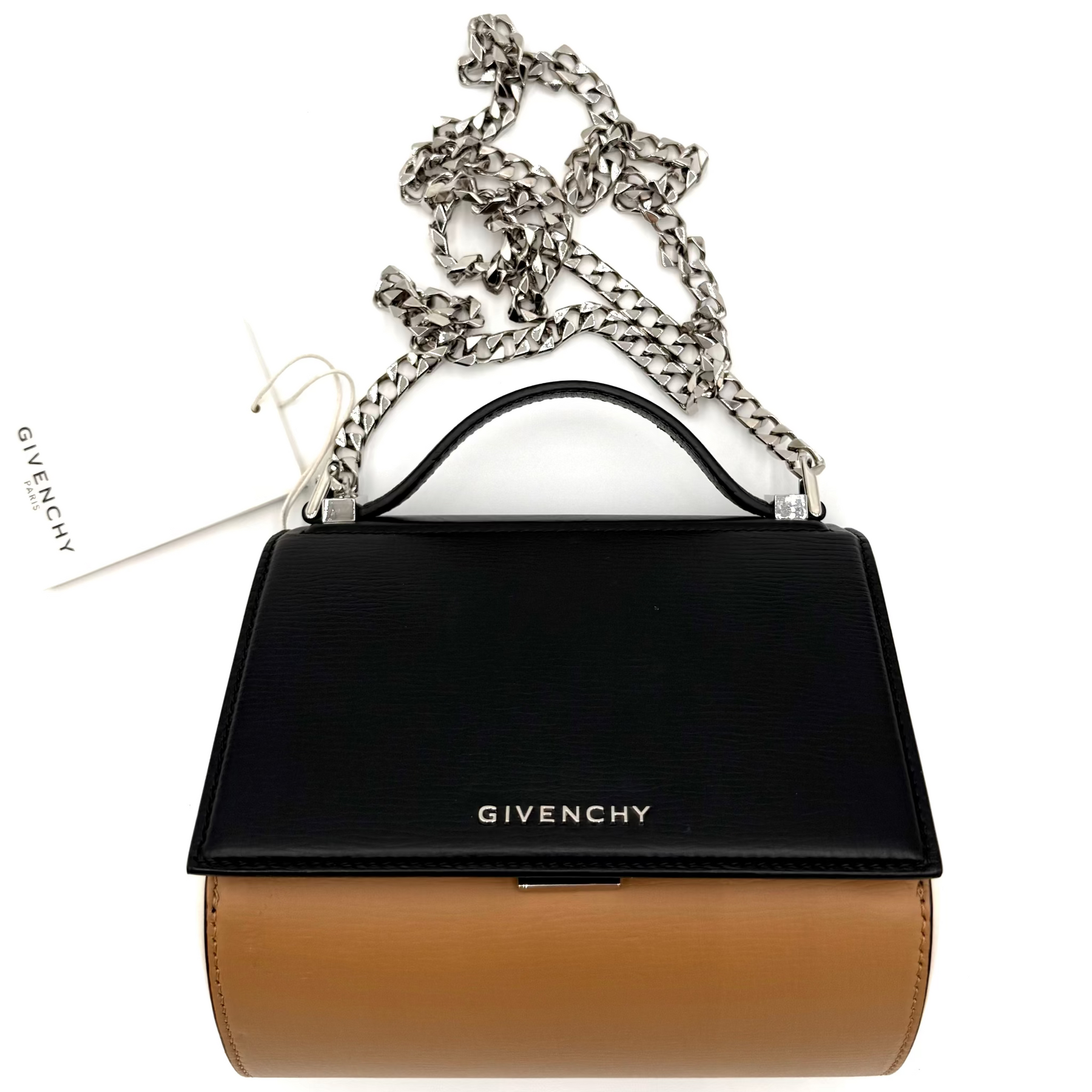 Designed with a softly structured, boxy shape, the Mini Pandora offers surprising functionality despite its compact size. Opens to a spacious interior, ideal for carrying daily essentials. High polish silver tone hardware and crossbody chain strap, it can be worn comfortably over the shoulder or hands-free.