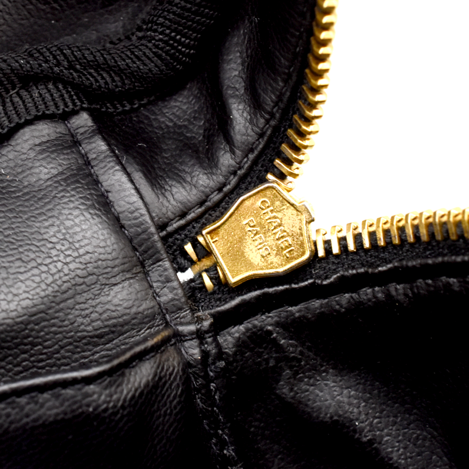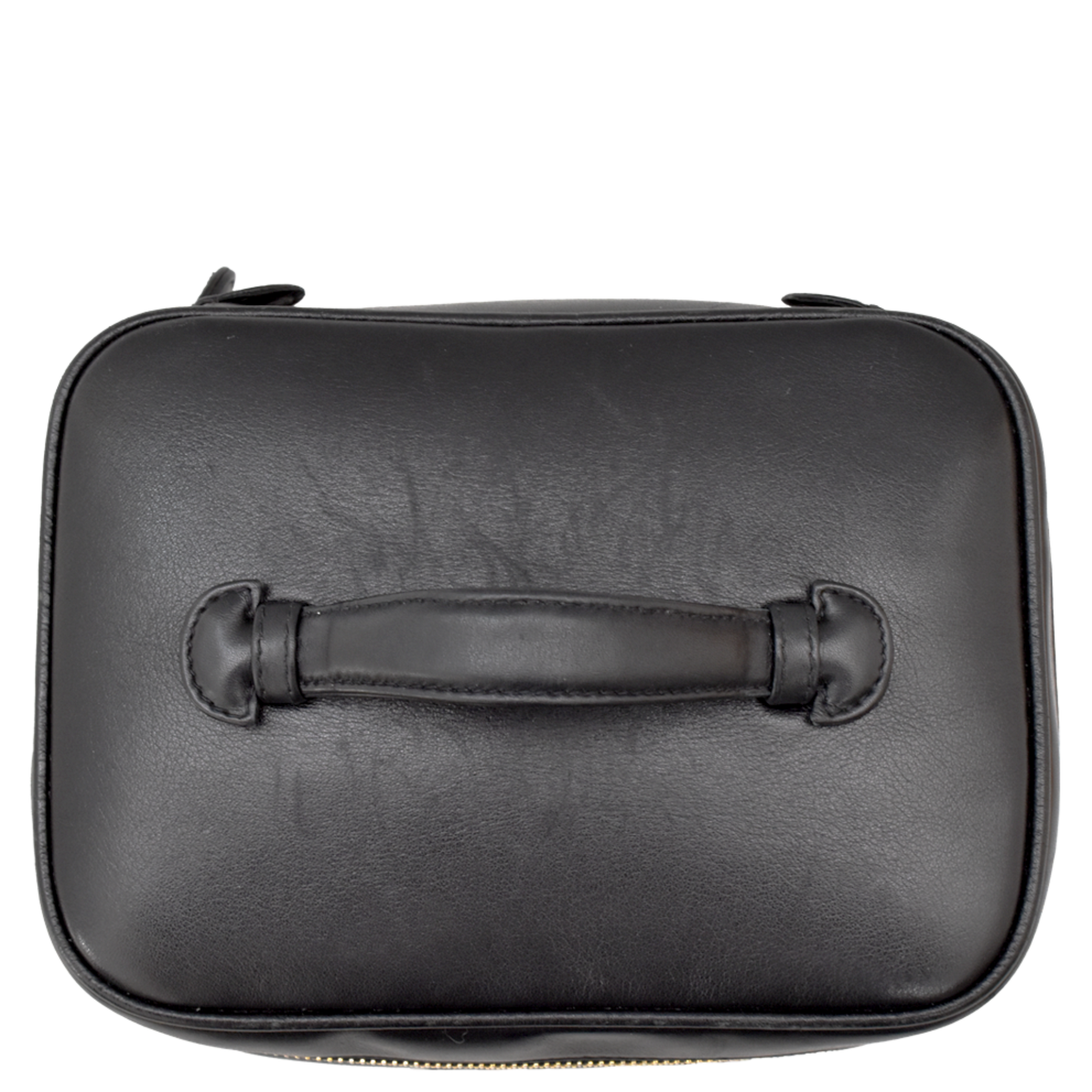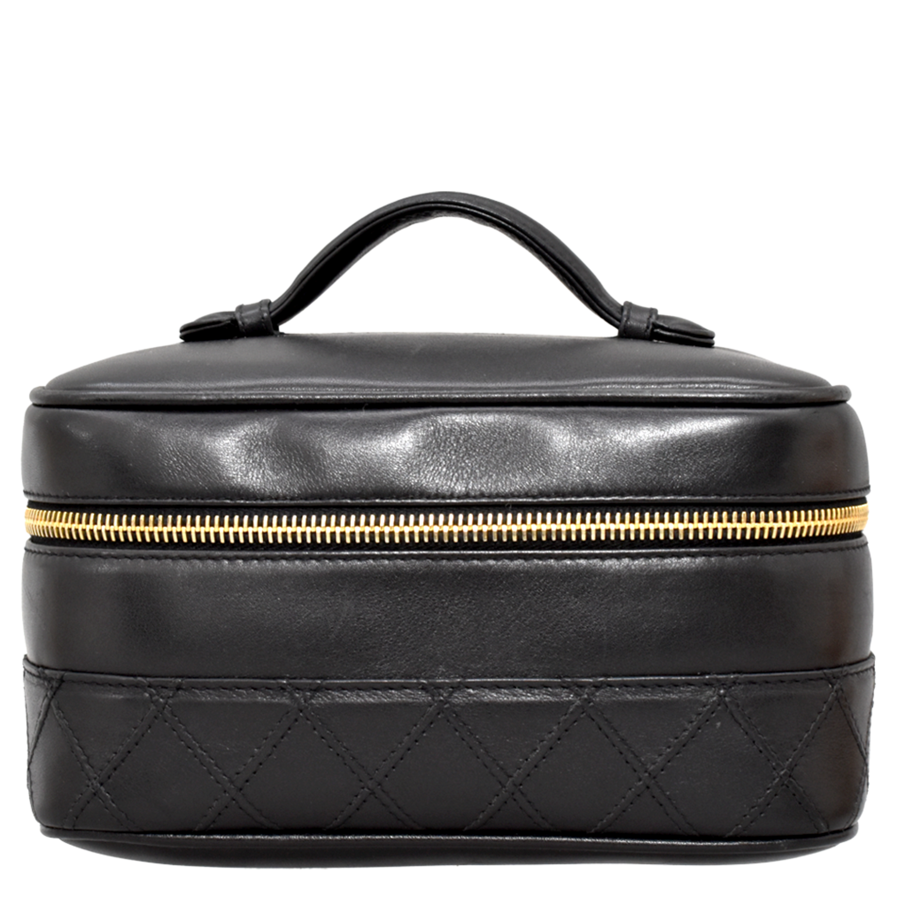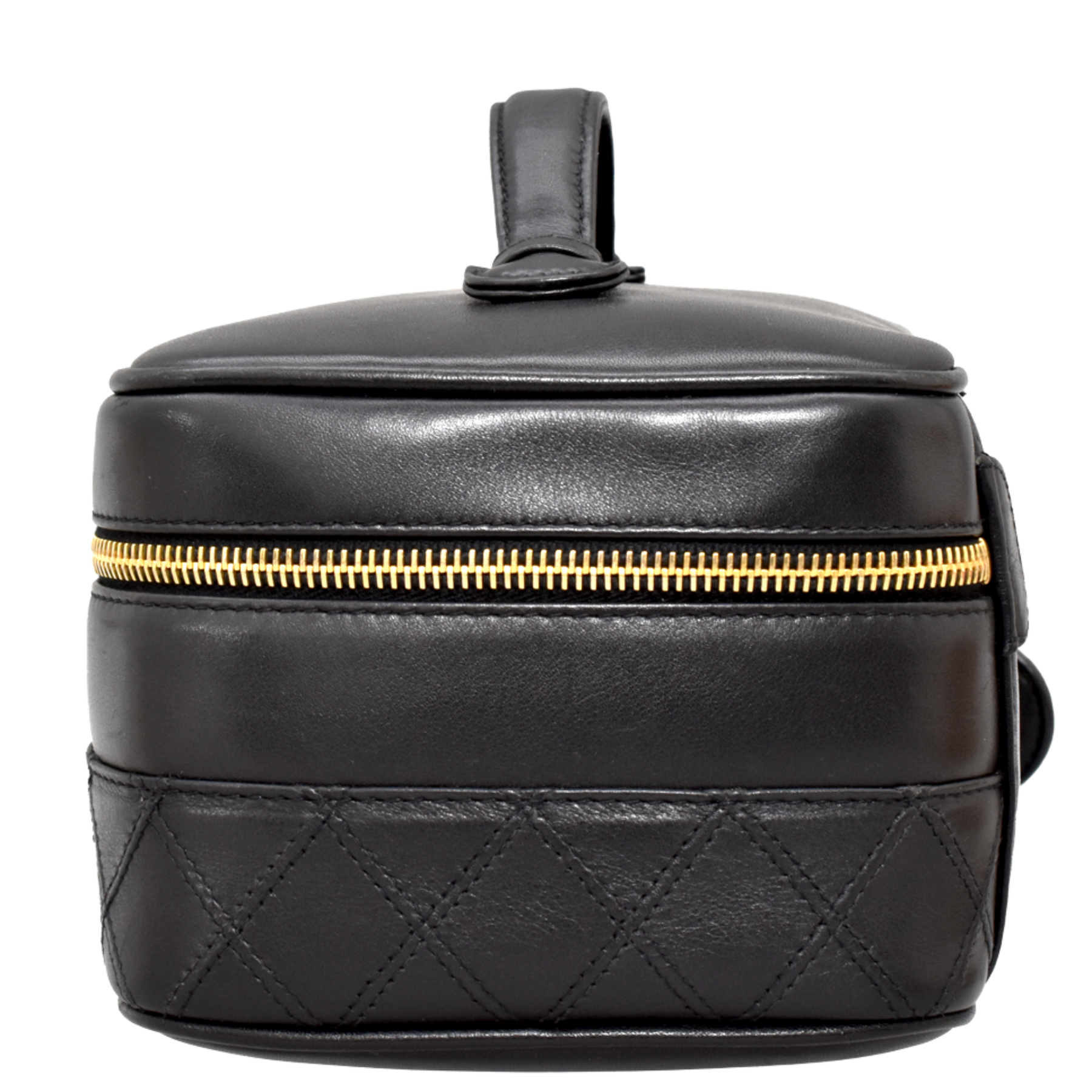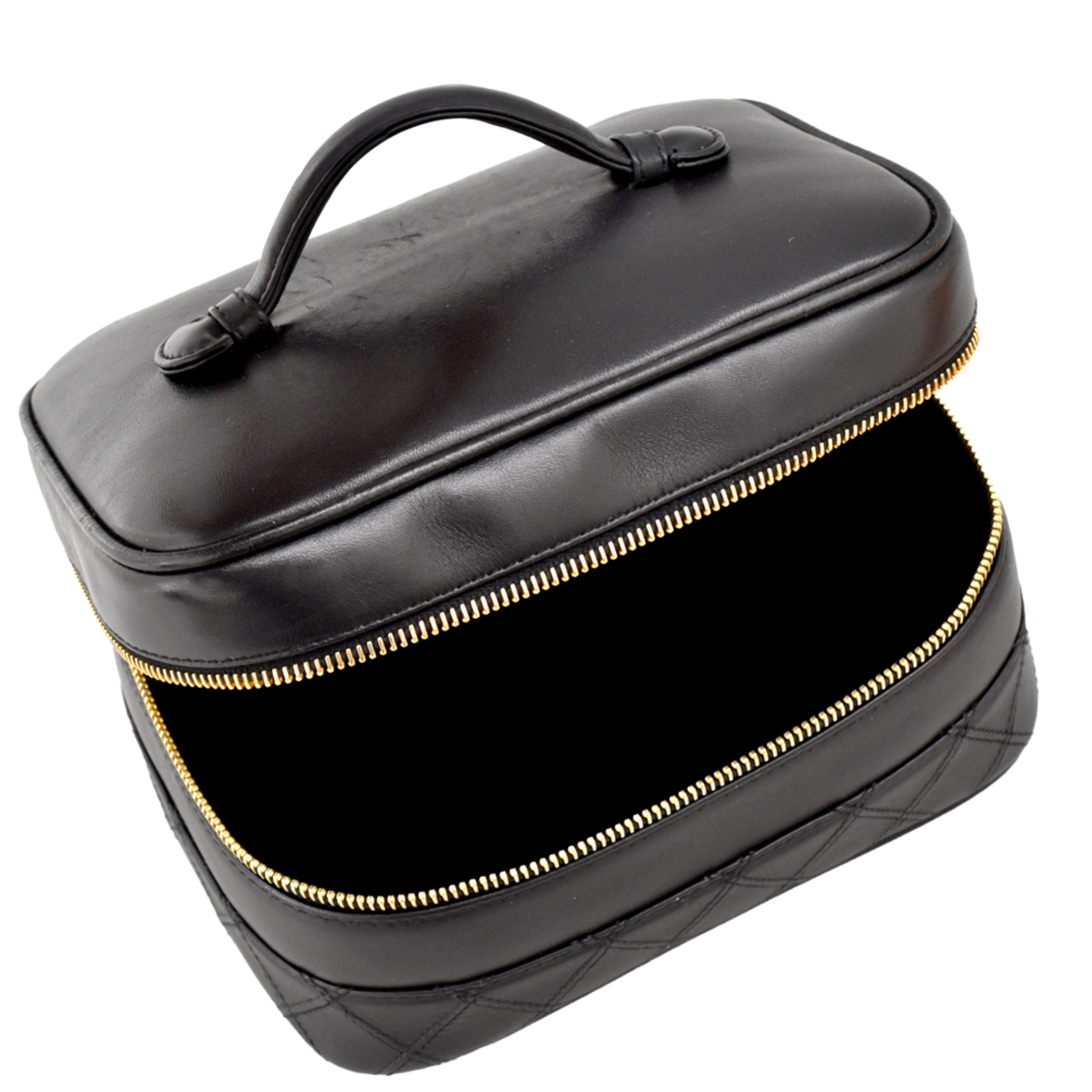 A timeless travel companion with unmistakable Chanel elegance. This vintage vanity case is crafted from smooth black leather and accented with classic diamond quilting for a subtle yet luxurious contrast. The gold-tone hardware gleams against the leather, with a signature Chanel logo zipper pull that adds the perfect iconic touch.