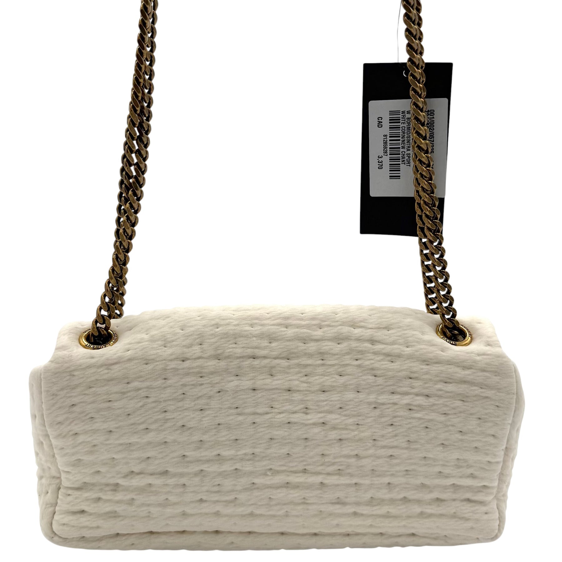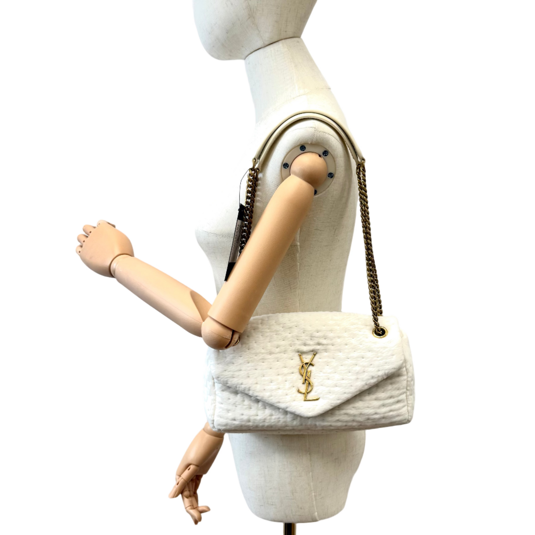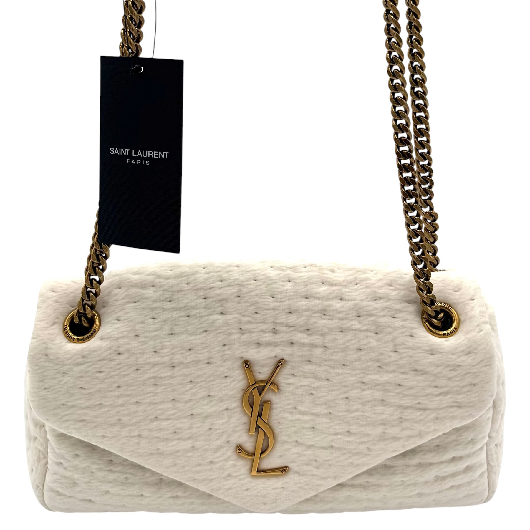 Elevate your look with the elegance of the Saint Laurent Calypso in cozy, quilted winter white. This luxurious bag fuses clean, modern lines with timeless craftsmanship β a striking fashion piece that suits both city streets and upscale evenings.