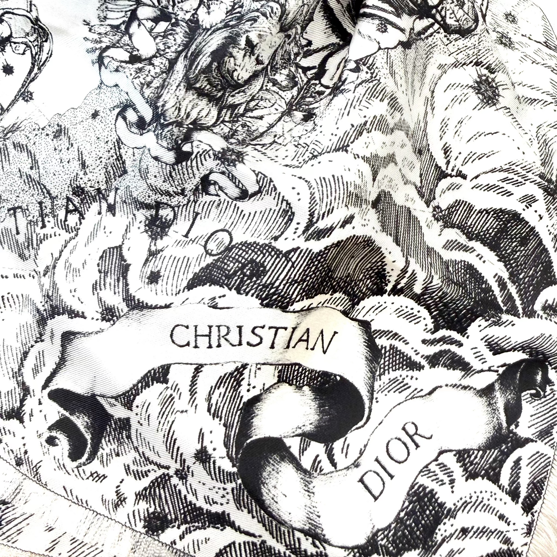 A Dior silk scarf. The design was created with Italian artist Pietro Ruffo and first appeared in the Cruise 2022 collection. It offers a modern take on the twelve zodiac signs, showing each one woven together with seasonal plants and flowers.