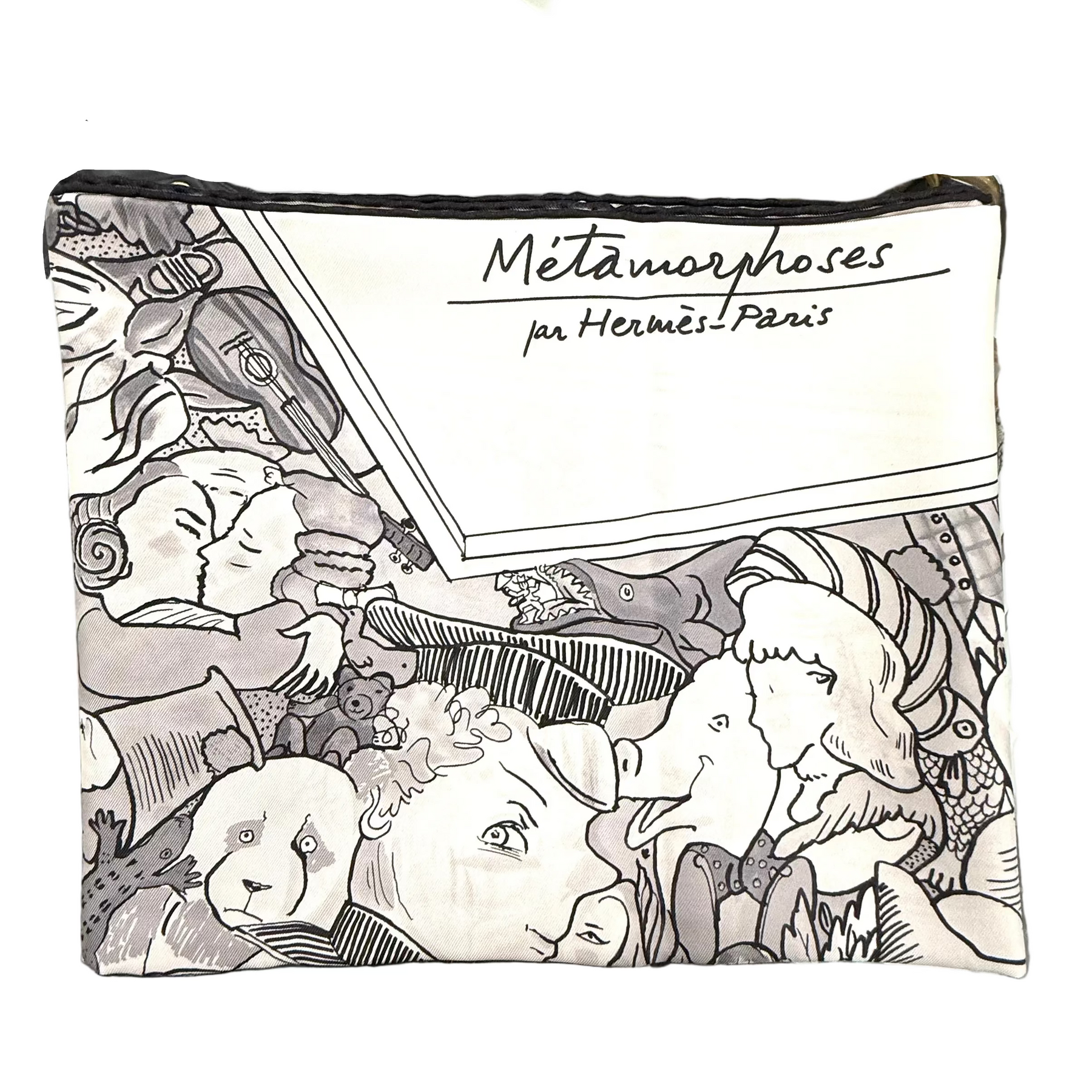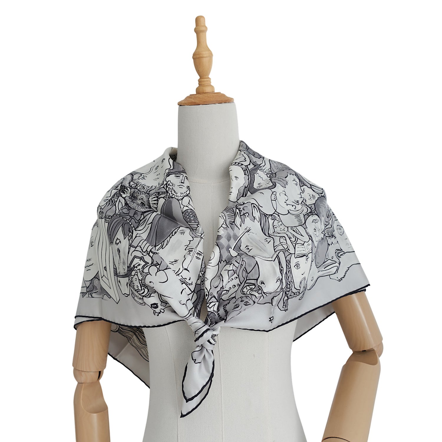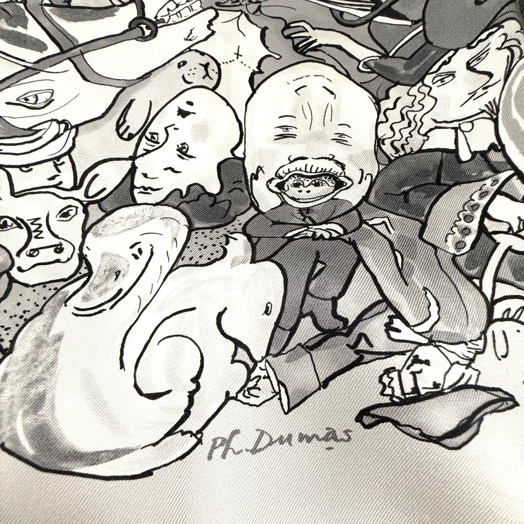 An Hermès scarf designed by Philippe Dumas. First issued in 2014 and inspired by historic optical illusion portrait puzzles from the Émile Hermès collection, the faces and figures on the scarf seem to change with perspective.