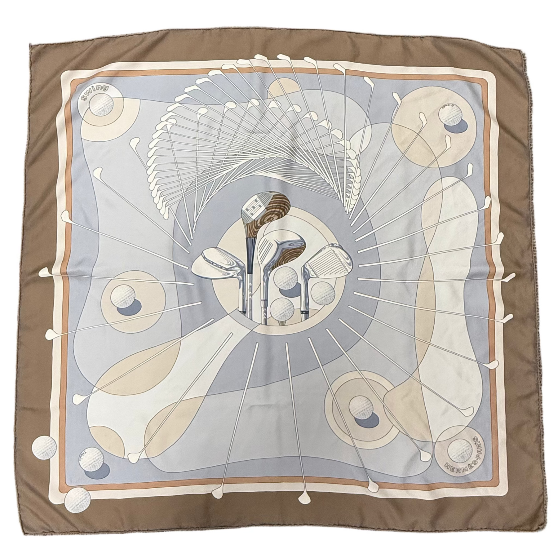 In a refined palette of deep blues, soft tans, and warm browns, Swing evokes a sense of calm sophistication. The muted tones blend seamlessly, offering both versatility and timeless appeal. Printed on Hermès' signature silk twill, the scarf has a smooth handfeel and a lustrous finish, ideal for draping, knotting, or styling as a statement accessory.