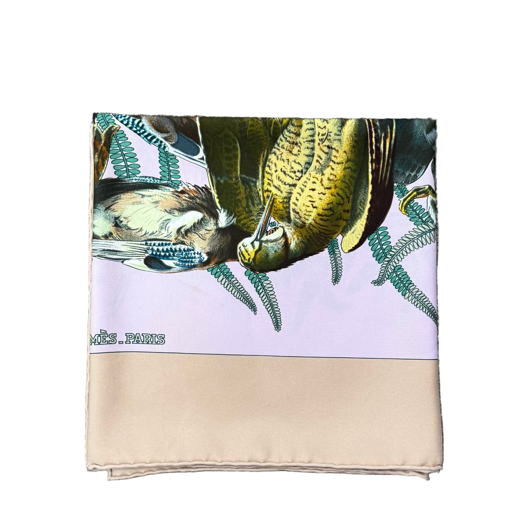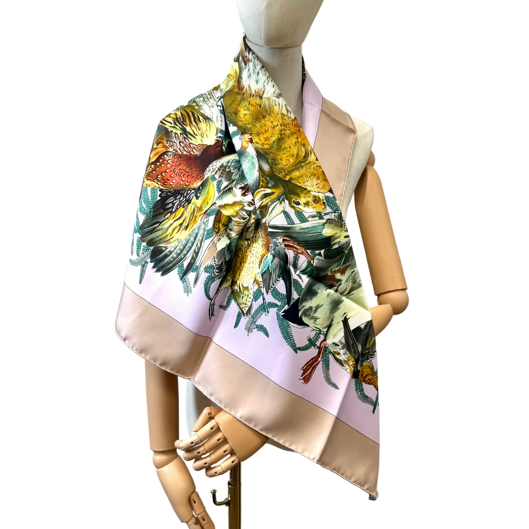 Crafted from sumptuous 100% silk twill, Gibiers showcases a central tableau of meticulously illustrated birds framed by lush foliage and intricate border work. The scarf’s harmonious palette and exceptional detailing make it a collector-favourite carré - timeless, sophisticated, and distinctly Hermès.