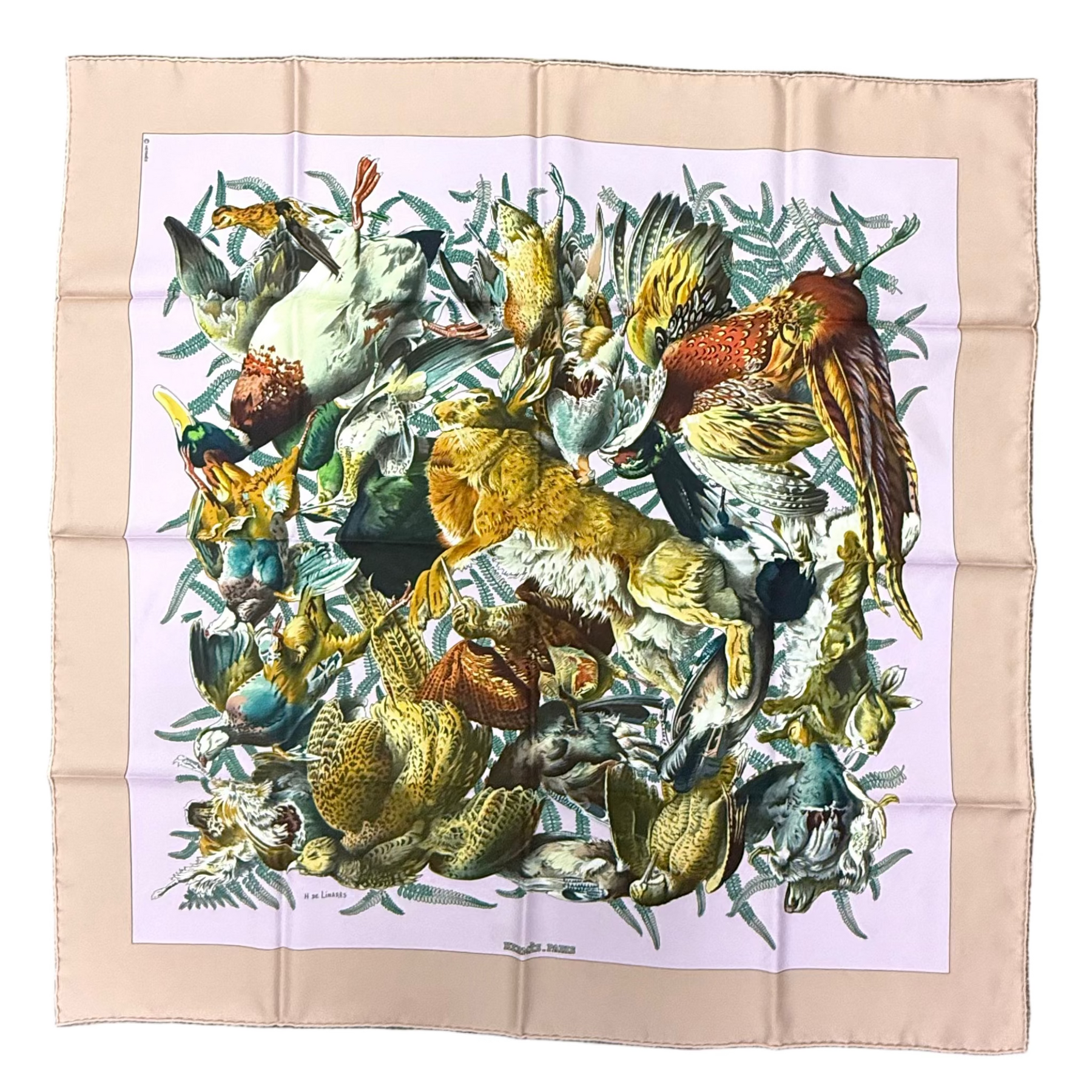 An ode to nature and classical French artistry, the Gibiers silk scarf by renowned Hermès illustrator Henri de Linares is a beautifully detailed composition celebrating game birds in their natural habitat. Known for his lifelike renderings and refined aesthetic, de Linares brings movement, elegance, and richness to every feather and flourish in this iconic design.