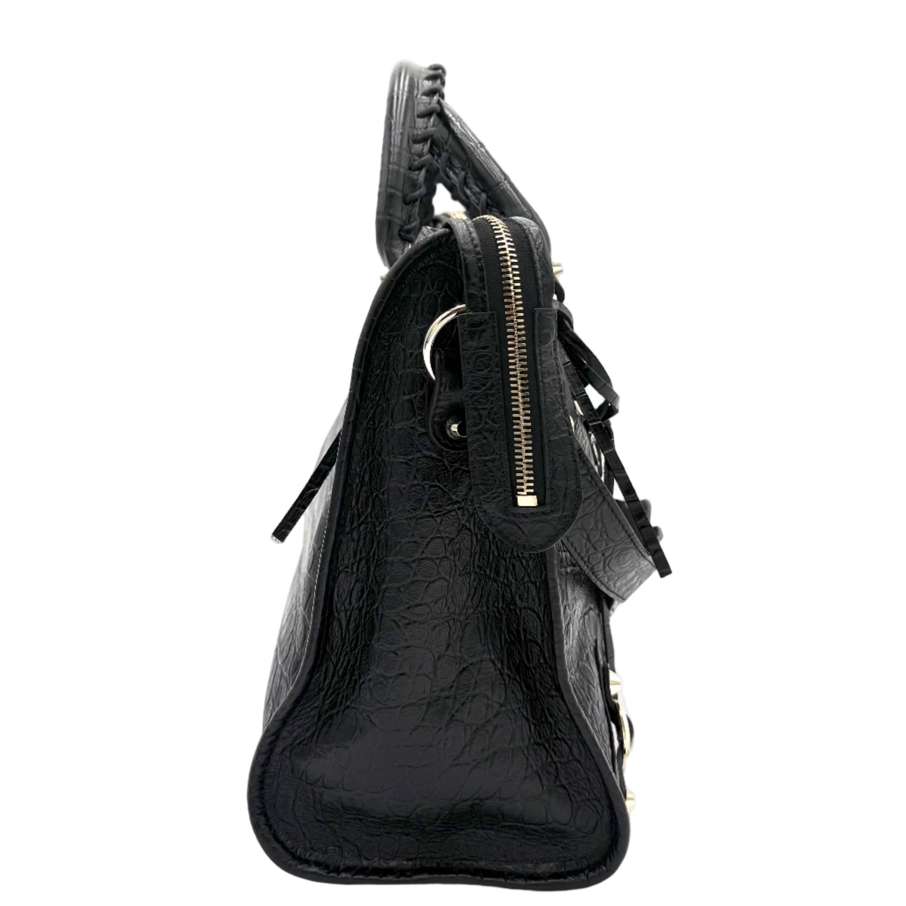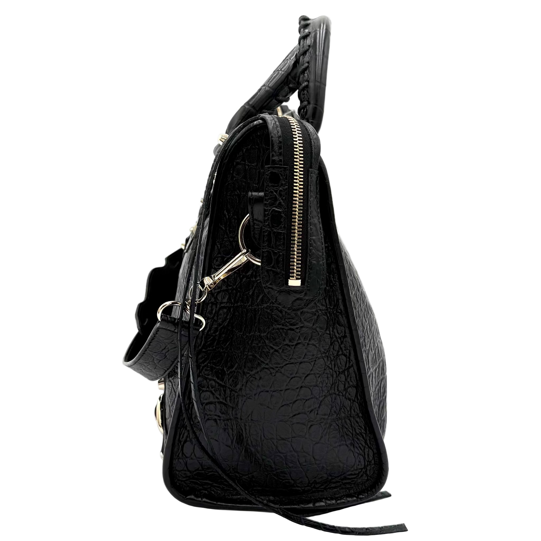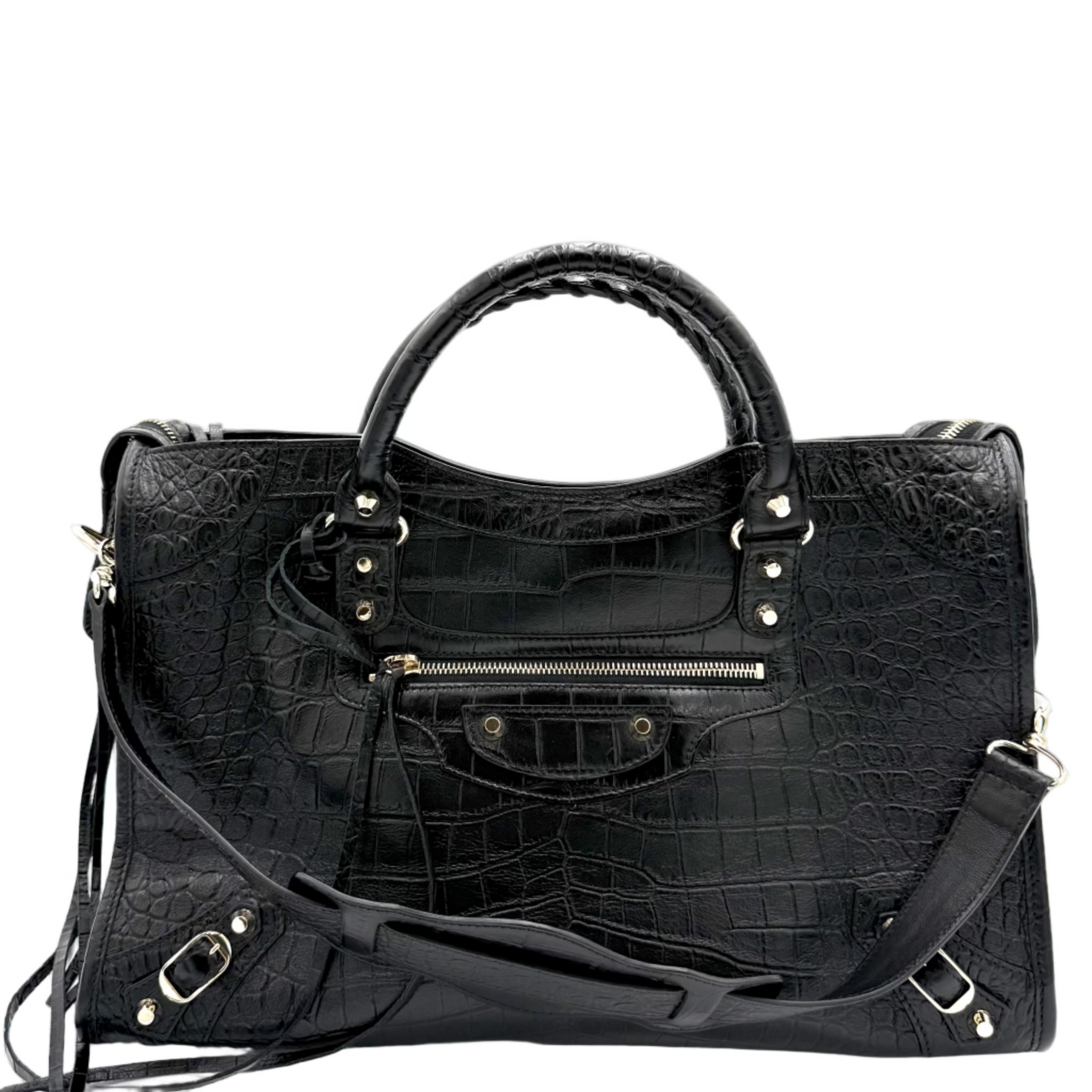A classically designed, Italian-made handbag in croc-embossed agneau lambskin leather features trailing zipper pulls, whipstitched top handles, and an optional strap for easy shoulder carry.