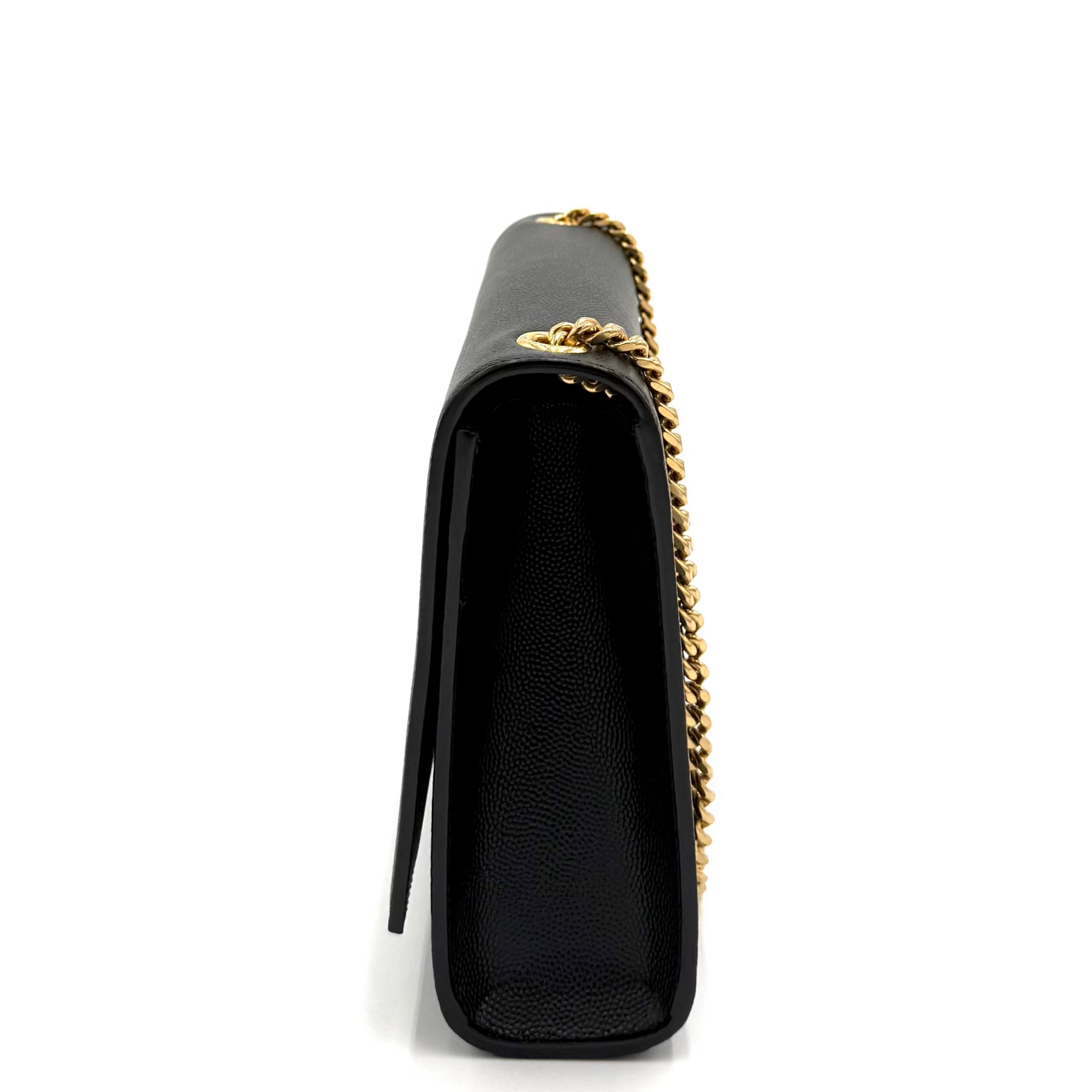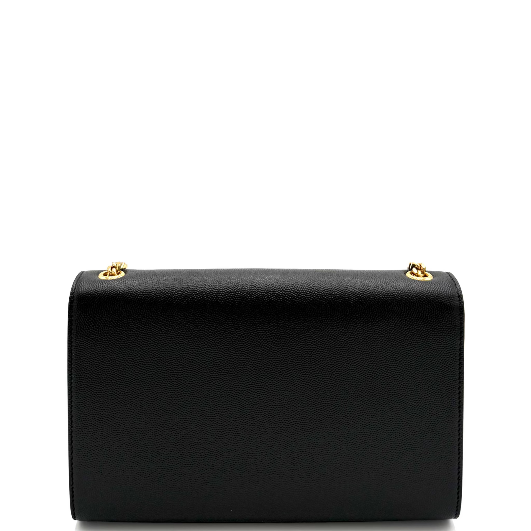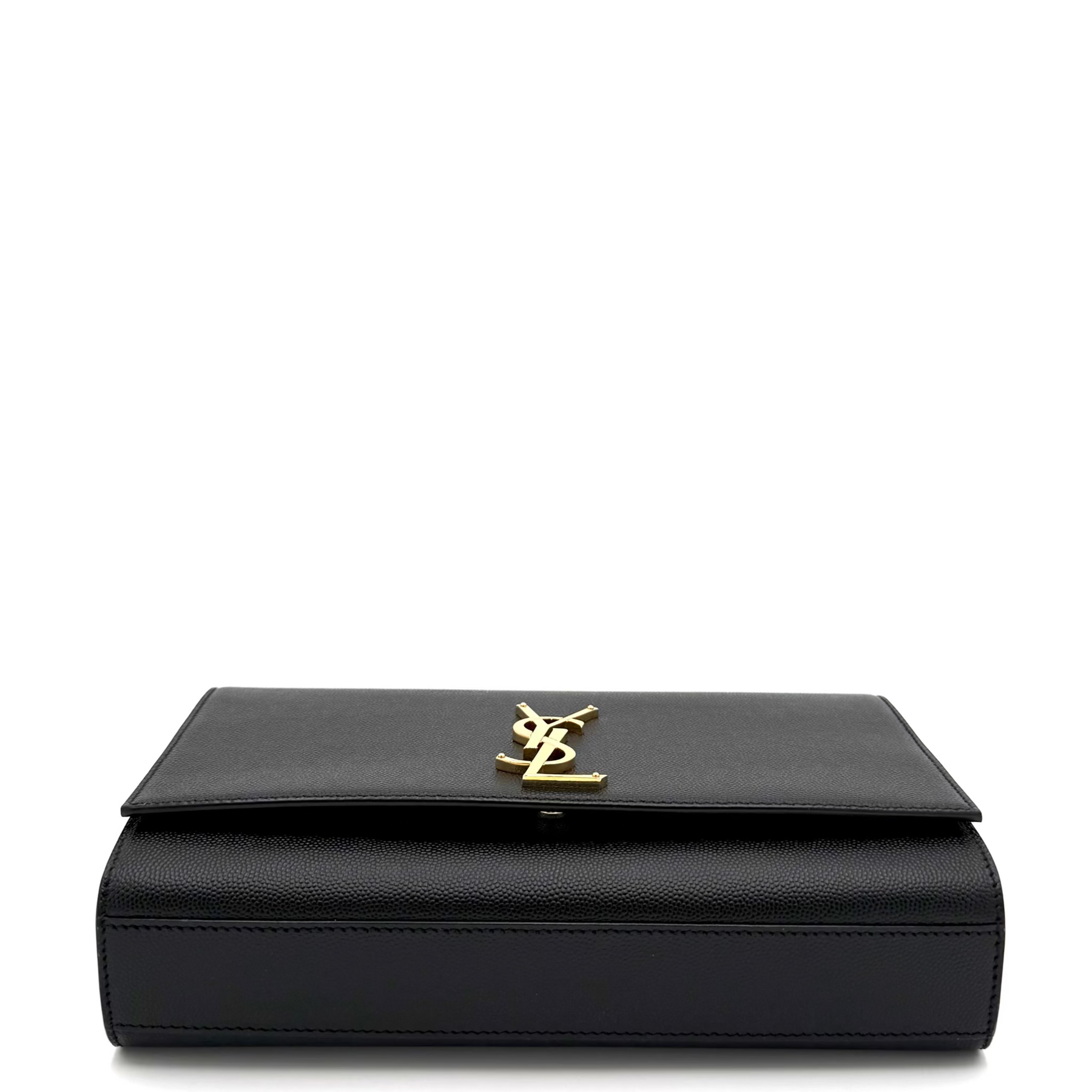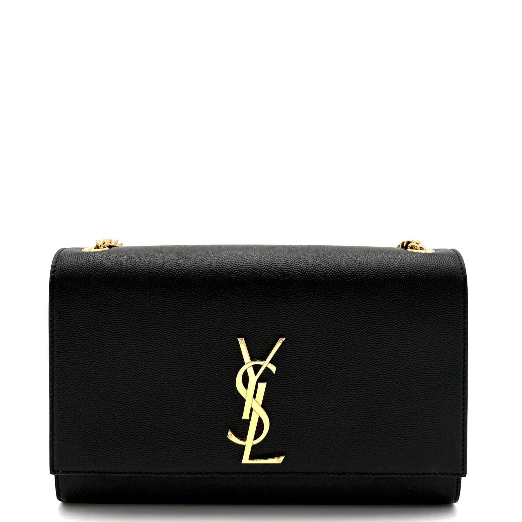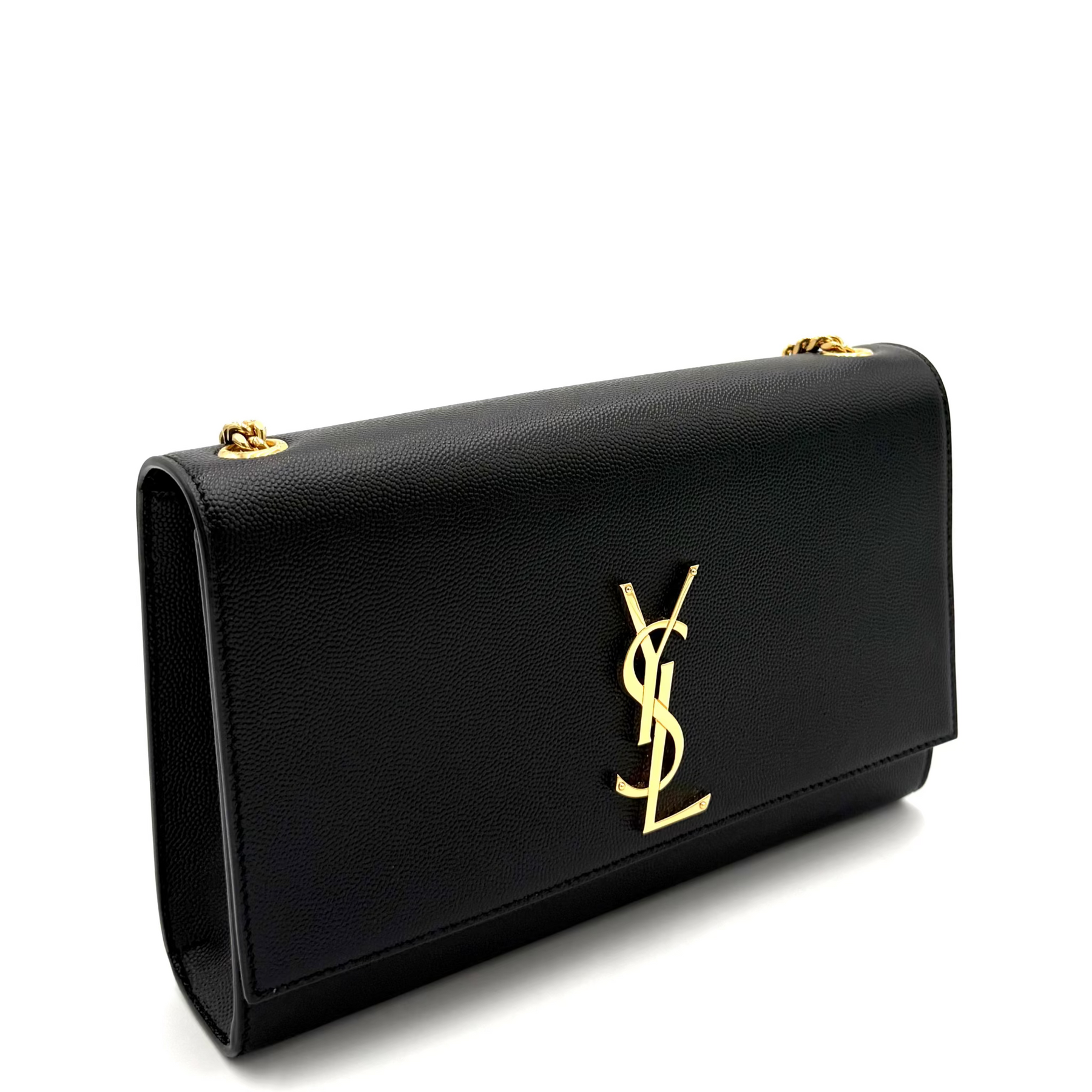 Gleaming YSL hardware contrasts beautifully against the black pebbled leather of a streamlined shoulder bag designed to carry your essentials in the chicest way possible.