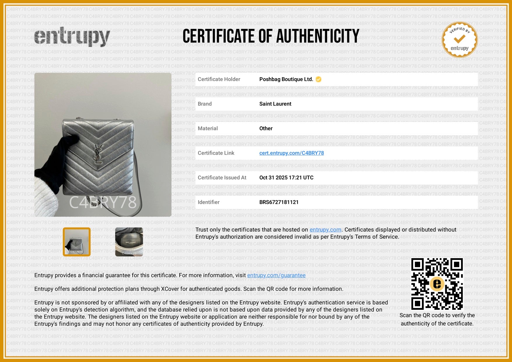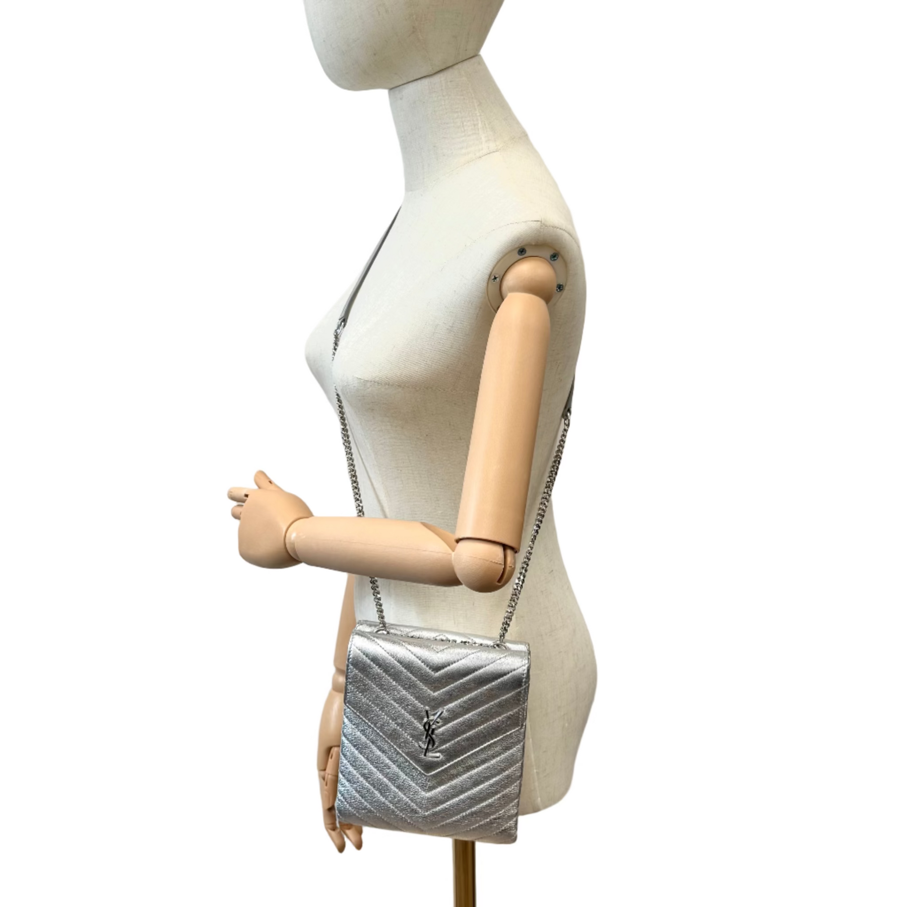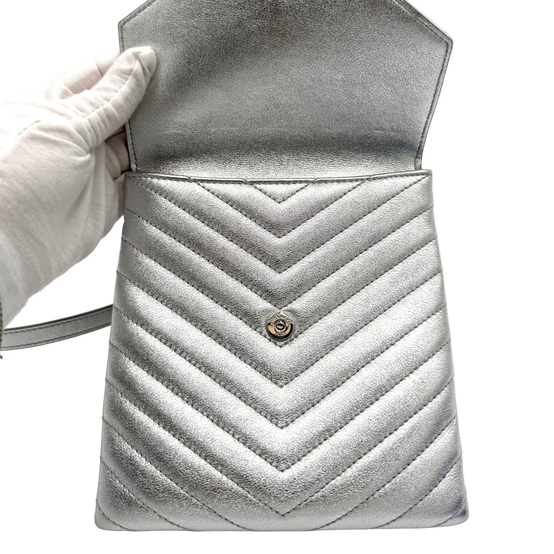 The metallic silver finish and iconic YSL monogram make this piece a radiant expression of Saint Laurent’s rock-luxe aesthetic — bold, refined, and effortlessly glamorous.