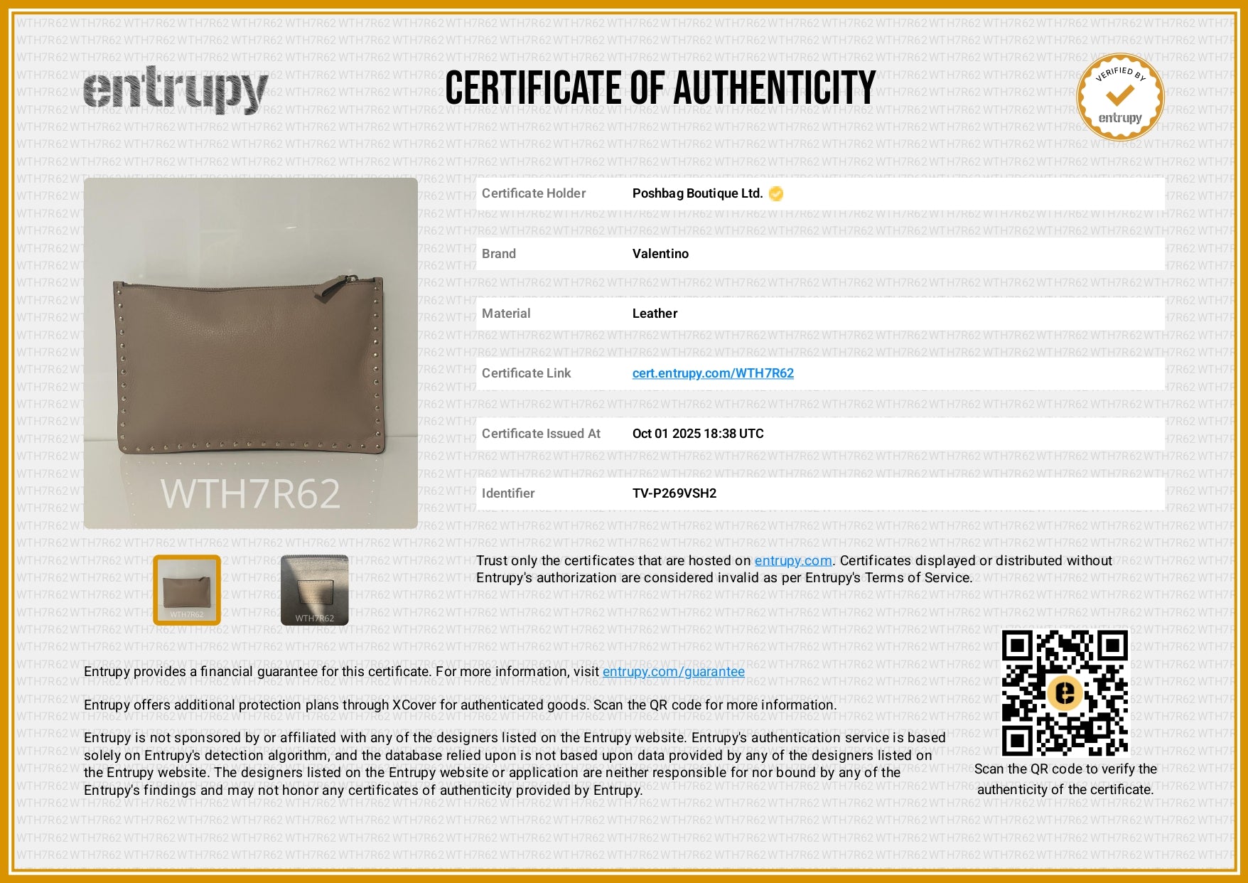 Signature pyramid rockstuds frame the silhouette of a slim, Italian-made clutch crafted from pebbled leather in a shade of pink called poudre.