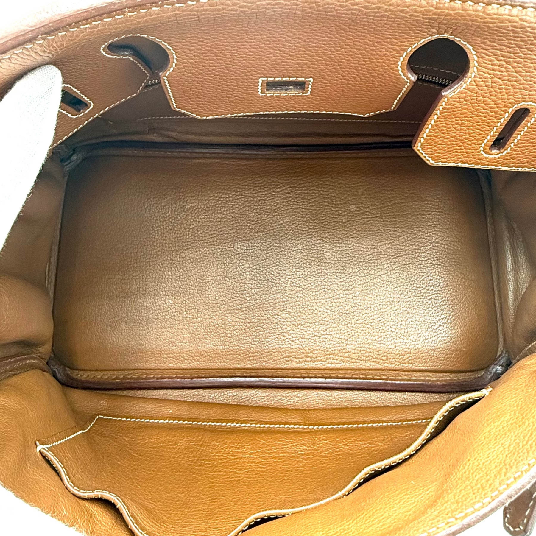 Overall: The bag has been carried and shows signs of the flattening on the leather corners. Interior is clean. No marks on the exterior leather. Hardware has minor surface scratches. Stitching is clean and fully intact.